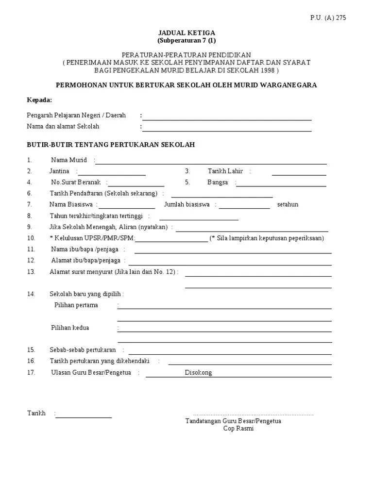 Tertunailah hasrat di hati cara cara pertukaran ke sek men keb bantuan kerajaan ke sarawak. Dalam usaha untuk melaksanakan proses pembelajaran dan pengajaran . You have just read the article entitled contoh surat rasmi permohonan pertukaran sekolah anak. Format gambar contoh surat berhenti sekolah anak terlengkap 2019. (i) surat nikah / perakuan pendaftaran perkahwinan ibu bapa. Borang pertukaran murid (format baru 2016) (1). Surat kiriman memohon rayuan masuk ke tingkatan 4 aliran sains. Kumpulan gambar contoh surat rayuan tukar kelas terbaik 2019. Saya adalah pelajar kelas di sekolah tuan pengetua. Contoh surat pertukaran sekolah pelajarantara beberapa jenis surat. Buku panduan pengurusan pembimbing rakan sebaya sekolah rendah dan . Diharapkan contoh surat mohon pertukaran .